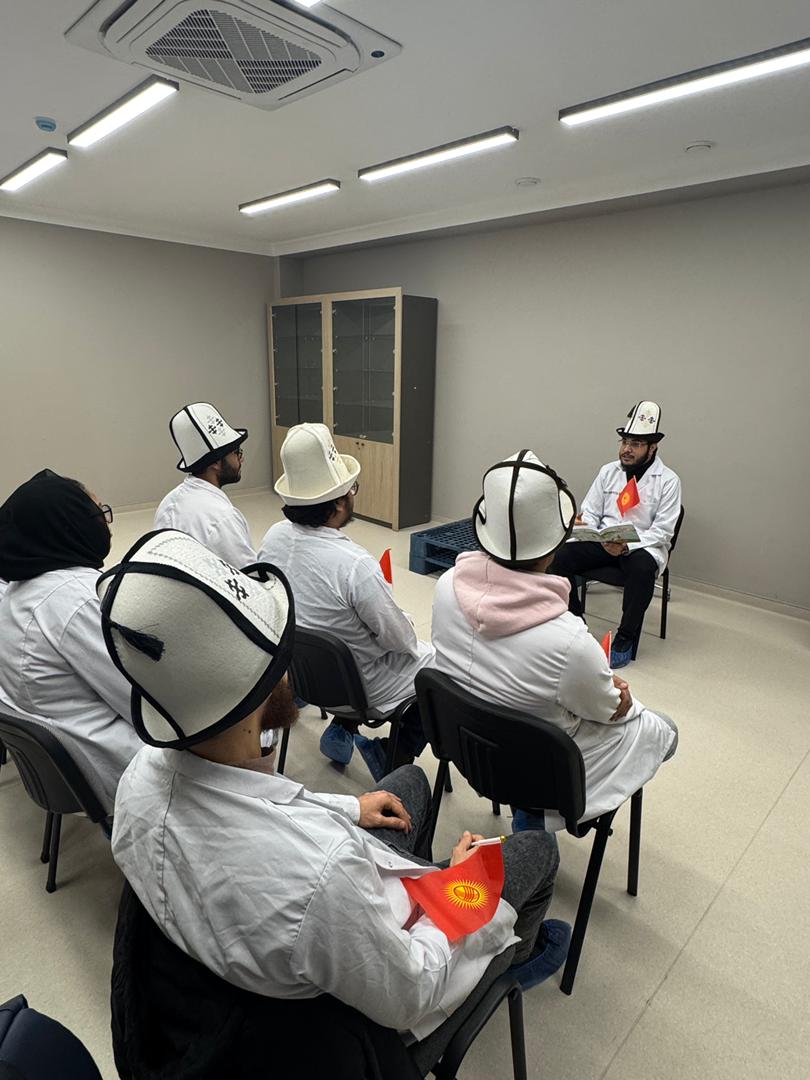 During the meeting, students were provided with information about the history and significance of the State Flag of the Kyrgyz Republic, its symbolism, and its role in the formation of national identity. Special attention was given to the traditional headdress of the Kyrgyz people — Ak Kalpak, which is an important element of cultural heritage and a symbol of national pride.